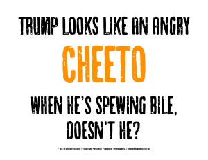 I can’t resist plagiarizing the whole “angry cheeto” meme either – love, love, love it!