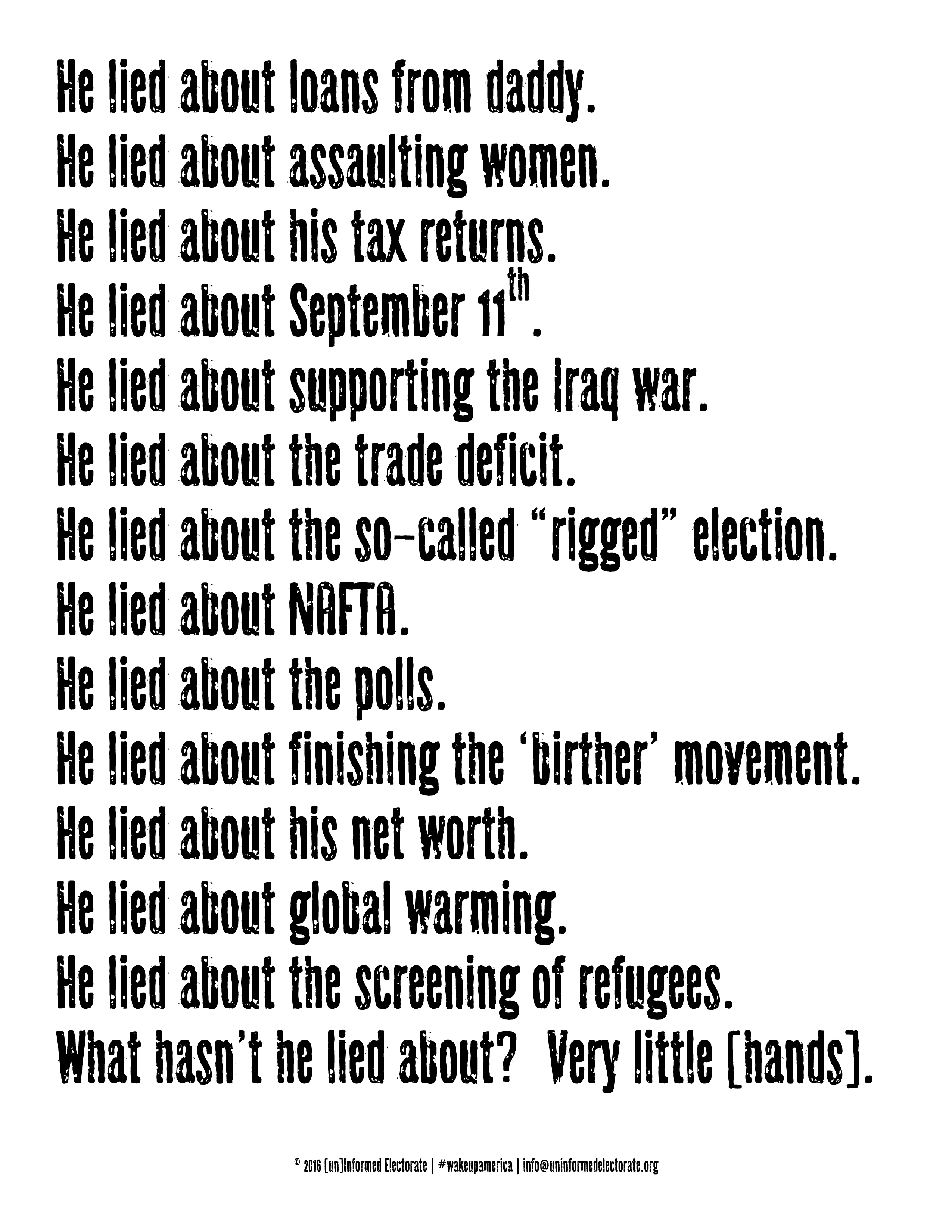 What a dirtbag this guy is! A political neophyte, dubious business leader, narcissist and world-class liar. Do not accept this most despicable person as President of the United States.