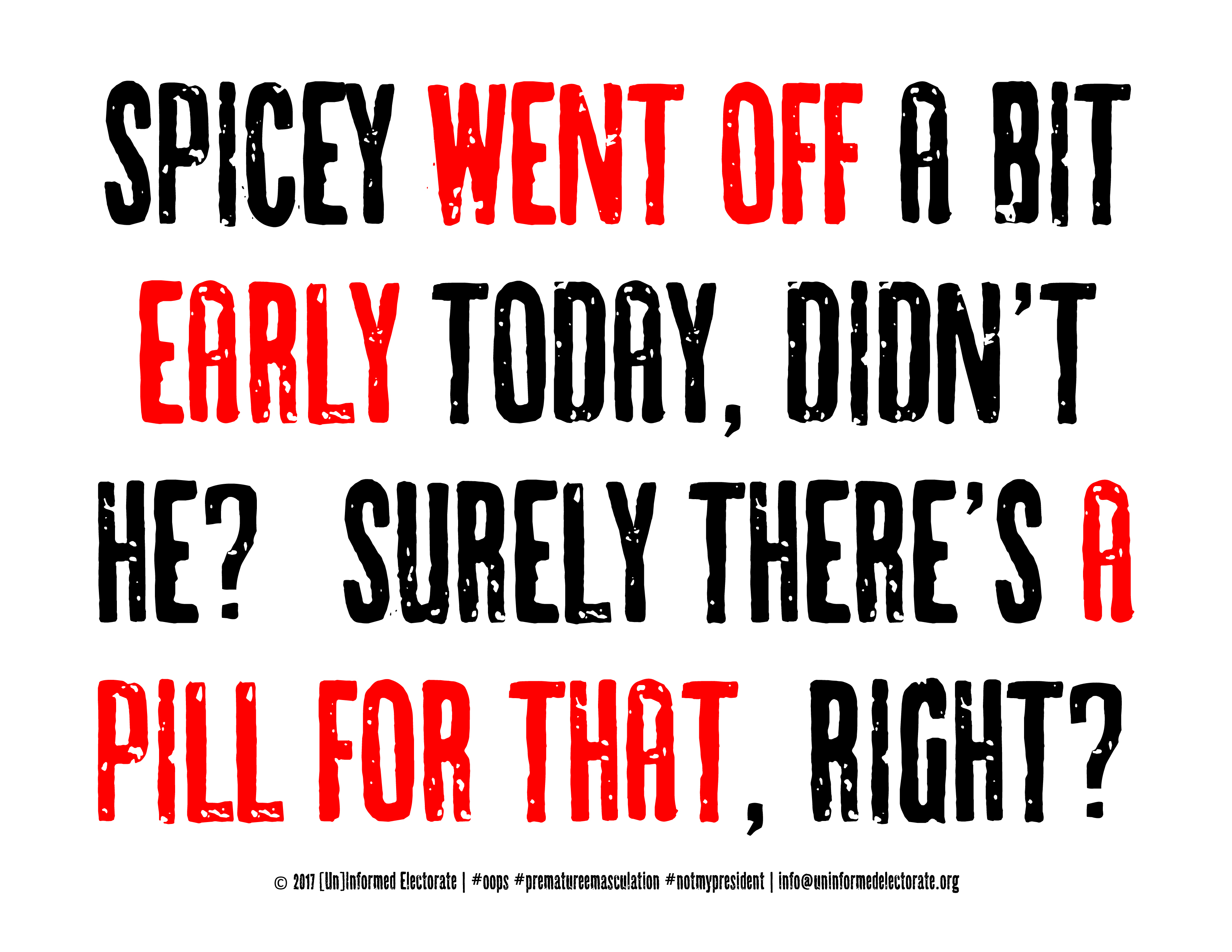 Maybe we should congratulate Ms. McCarthy, er, uh, um, ah, I meant to say Mr. Spicer on exercising undue restraint, since his idiot of a boss waited a scant eleven minutes to start pleasuring himself with his own congratulatory blast via Twitter this morning. Sure, it was only a so-called “re-Tweet”, (the social media equivalent of an email forward), from that remarkable touchstone of honesty and integrity, The Sludge Report, er, uh, um, ah, I meant to say The Drudge Report, but still, c’mon folks, a mere 11 minutes? Definitely premature…