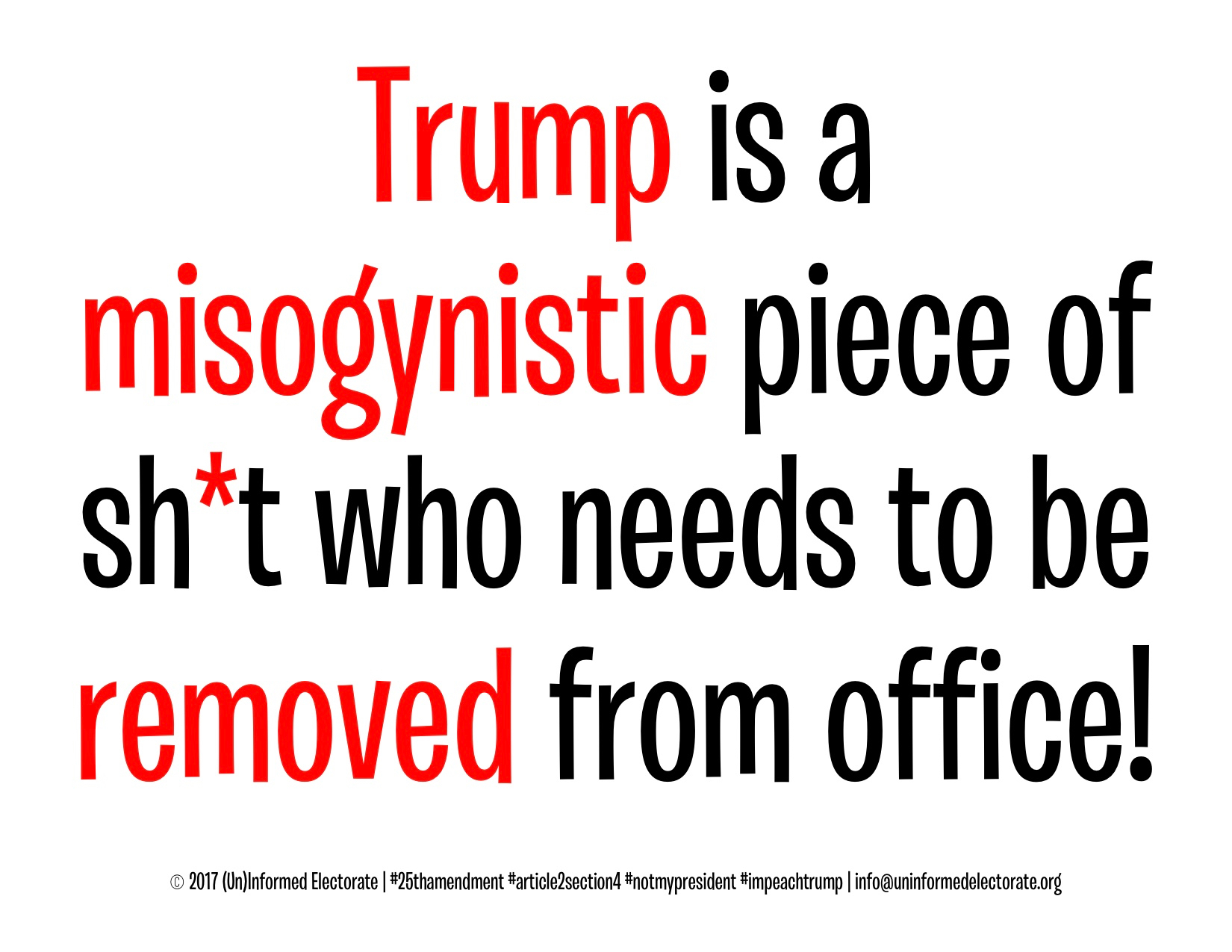 Alrighty, Kara Alaimo pretty much nailed it in her opinion piece on Sunday; there is absolutely no reason for this miserable excuse for a president* – who happens to be explicitly endorsing violence against women – to spend even another minute at 1600 Pennsylvania Avenue!