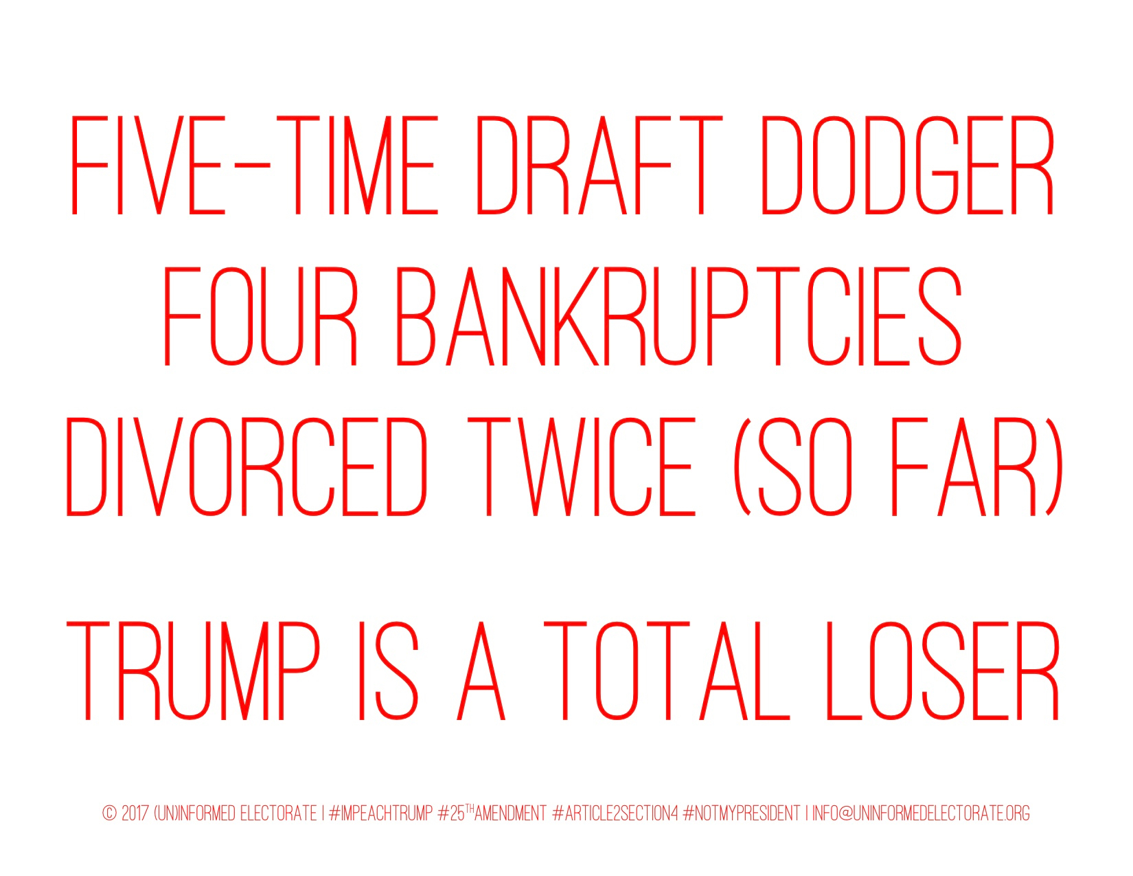 P.S. According to a Newsweek article published Saturday, the Loser-in-Chief’s™ approval rating sank to an all time low. Gallup reports a 35% approval rating and a 60% disapproval rating. Fully 1/3 of those polled think the draft-dodging, bankruptcy-filing, twice-divorced narcissist from Queens is doing a good job, while nearly 2/3 of those polled are ready for a change – and this is after only 10 months in office – yikes!